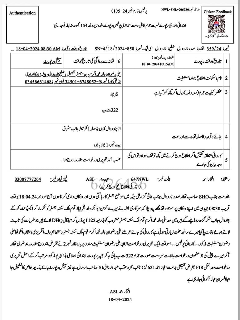 شکر گڑھ: نوجوان کے لواحقین کی درخواست پر ایف آئی درج کر رہے ہیں۔